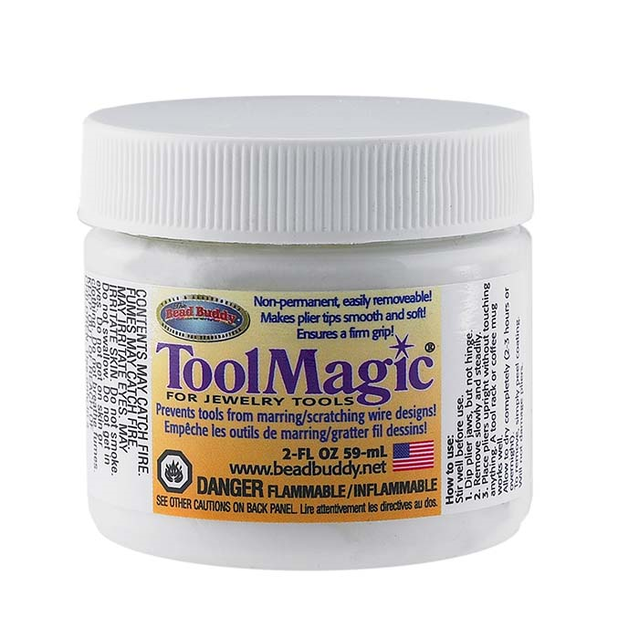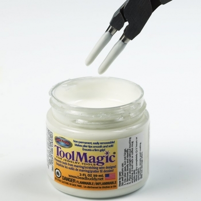 Use Tool Magic® on pliers tips to prevent scratching or marring your wire designs and workpieces. Simply dip the plier tips into the jar and stand them upright for 2–3 hours to dry. The smooth, soft coating on the tips won't damage your work. To remove the protective coating, simply peel it off. Tool Magic will not damage your pliers. Each jar contains 2 oz. of Tool Magic solution.