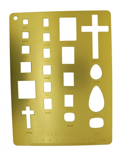 This template has all the common calibrated sizes for marking out square & rectangle shapes. Squares 8 x 8 to 27 x 27. Rectangles 12 x 8mm to 35 x 25mm. Crosses 34 x 19mm and 65 x 40mm. Pears 23 x 18mm and 24 x 40mm. Antique Cushon 16 x 14mm and 22 x 16mm. If you are ordering a template you may also be interested in a scribing pen set, for marking the outlines onto your stones.
