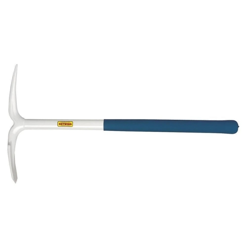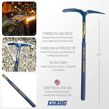 The blade end is perfect for digging and the pointed end is great for breaking up hard dirt and prying rocks. Vinyl Cushion Grip. Estwing's all Steel Construction Geo/Paleo Pick has a 25" overall handle length, 14" overall head length from pointed edge to chisel edge. Has a durable powder coated finish and a textured vinyl grip for added comfort.
